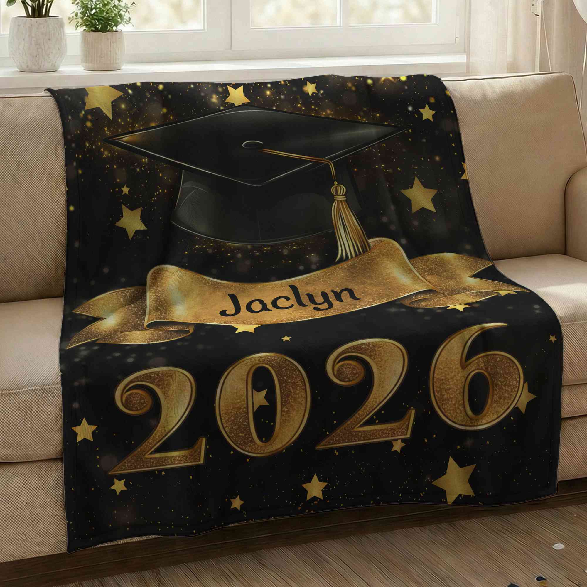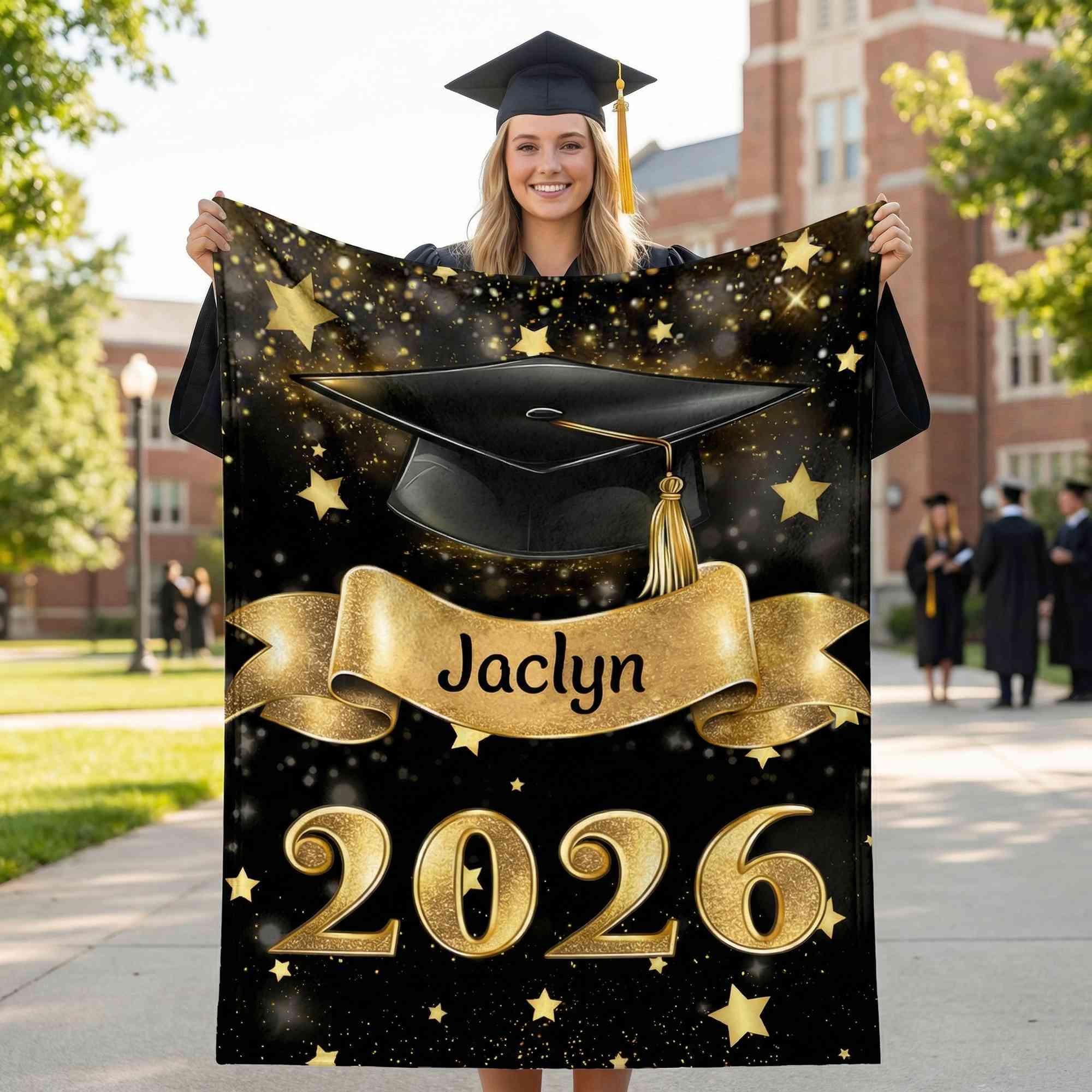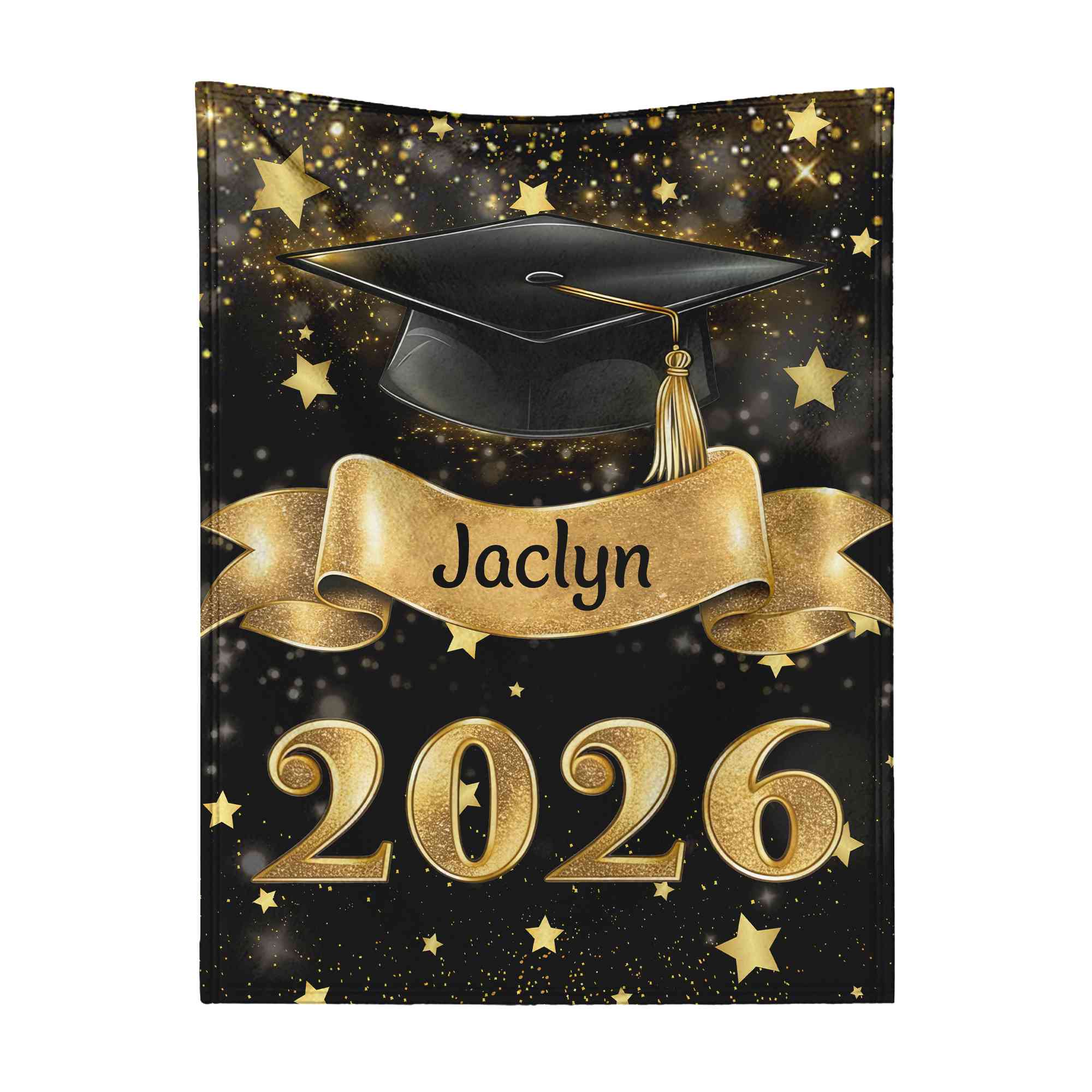 | Style | Personalized Black Graduation Cap Gold Scroll Blanket with Name & Year |