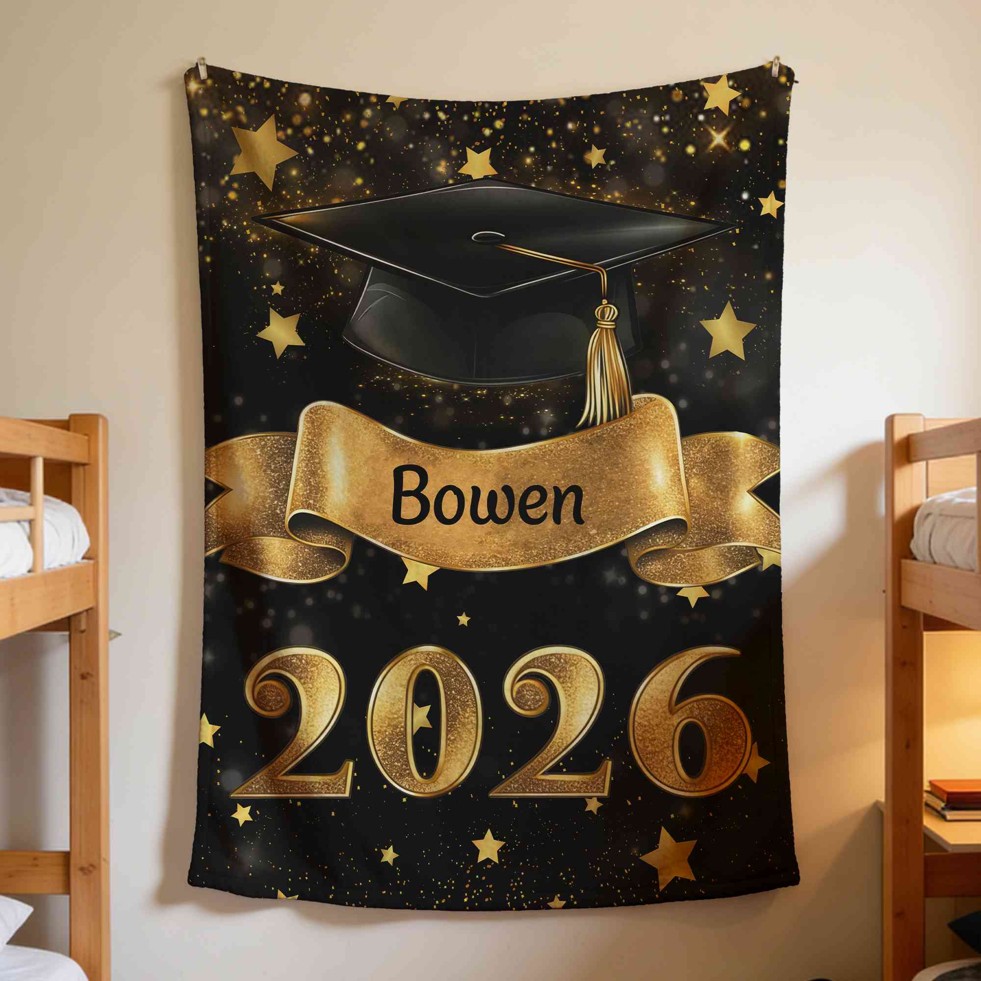 Graduation-Inspired Design - This personalized blanket features a classic black graduation cap and elegant gold scroll design, symbolizing achievement, success, and new beginnings. The stylish graduation-themed artwork creates a meaningful keepsake that celebrates an important milestone while adding a decorative touch to any bed or couch.