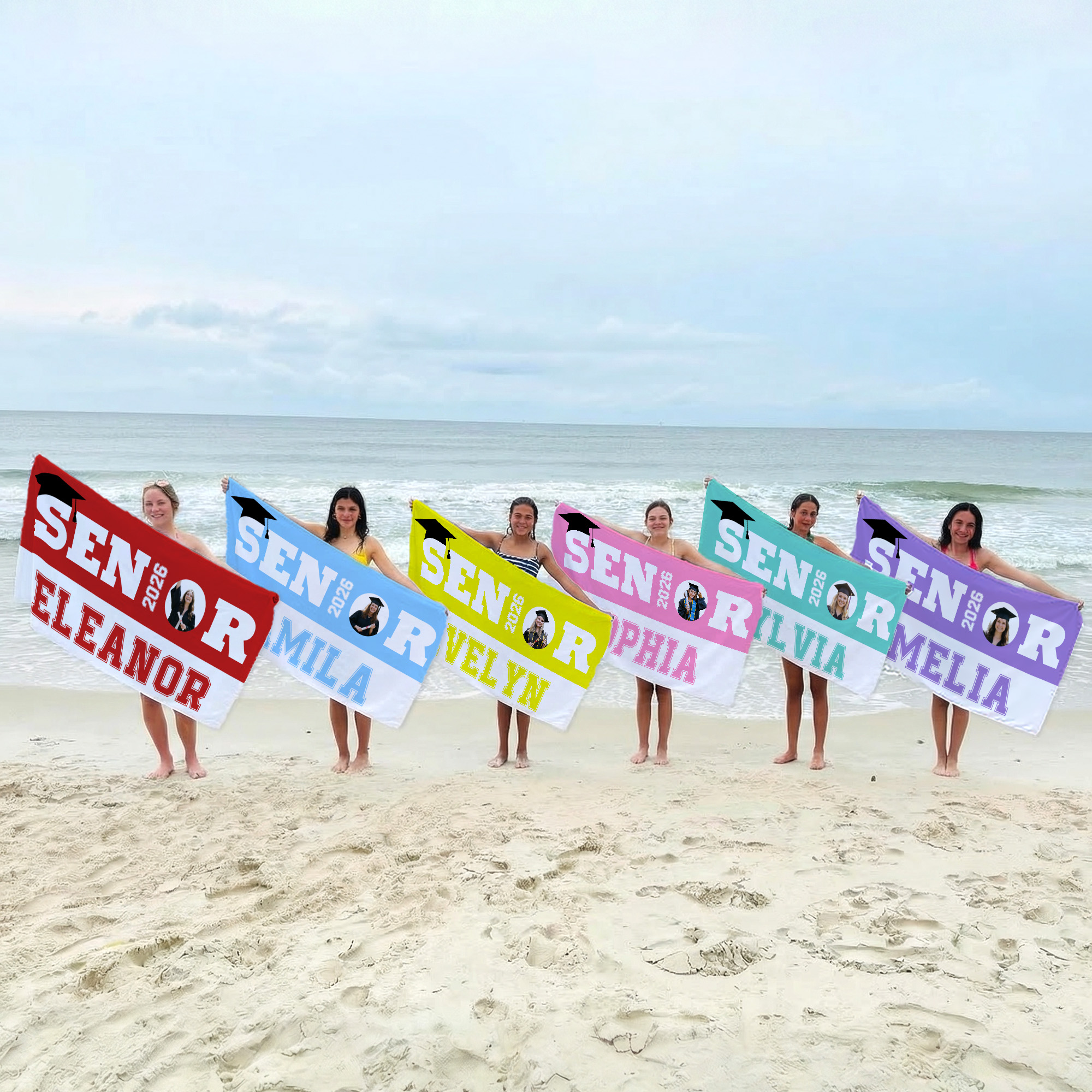 Bright Graduation Design - The towel features a lively beach-inspired layout with bold “SENIOR 2026” text, blending vibrant colors and a relaxed coastal style that captures the excitement of graduation season.